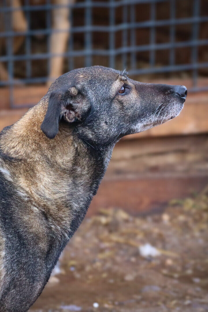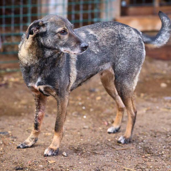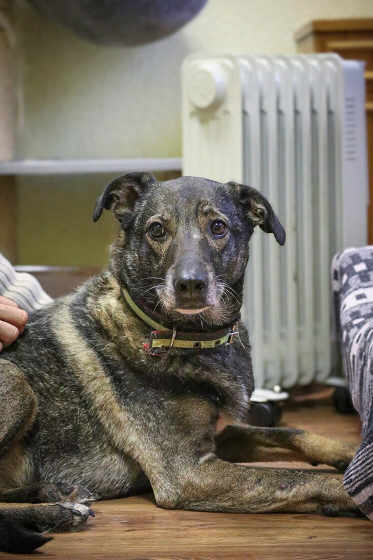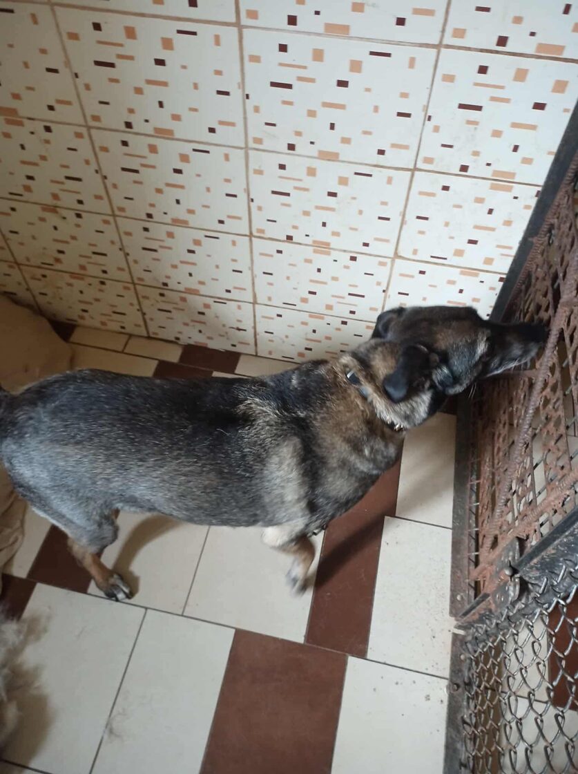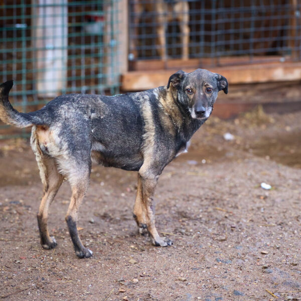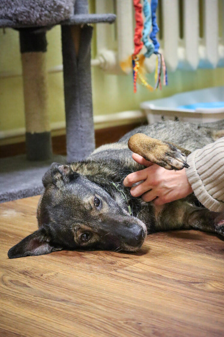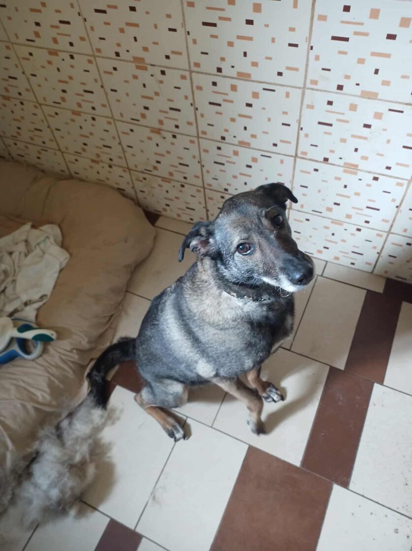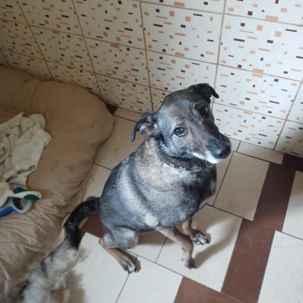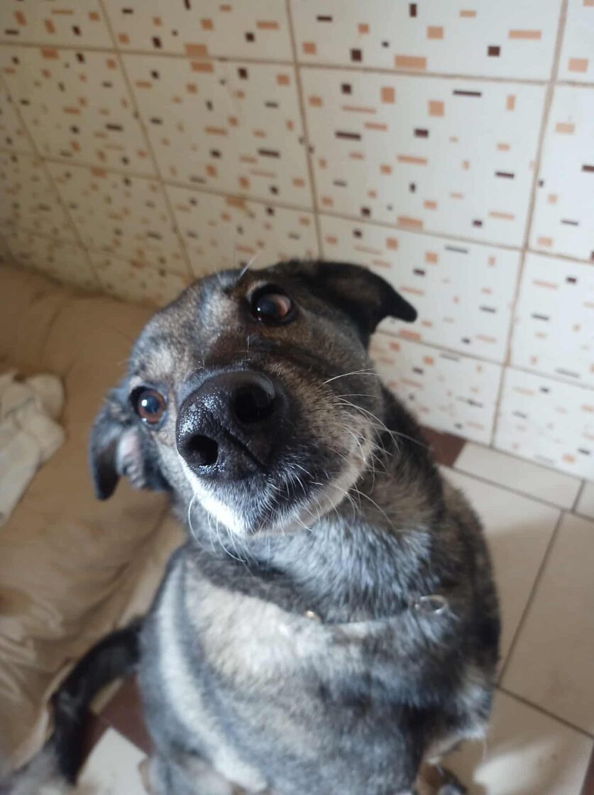 Patekimo į prieglaudą istorija neeilinė. 2024 m. spalį gavome pagalbos prašymą – moteris partrenkė šunį. Atvykus radome Pilkę griovyje. Jai lūžo dešinė priekinė ir galinė kojytės. Rentgeno tyrimas atskleidė dar vieną detalę – viena iš kojų buvo lūžusi ir anksčiau, joje jau buvo įdėta plokštelė. Šeimininkai taip ir neatsirado.