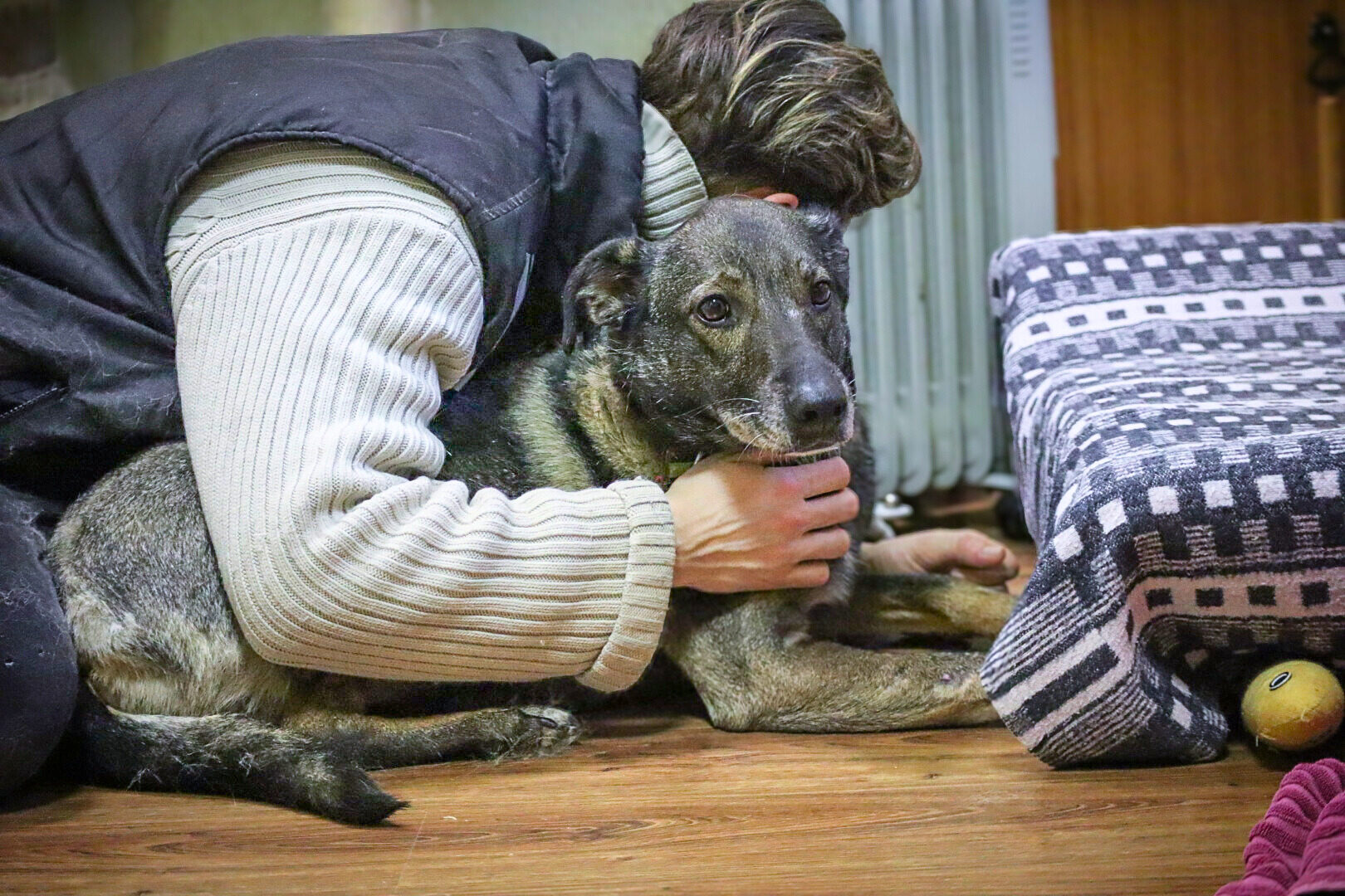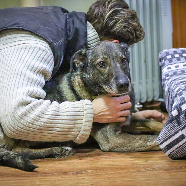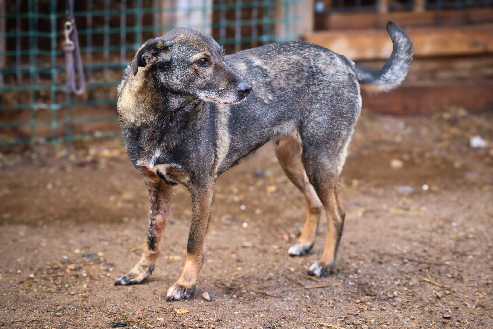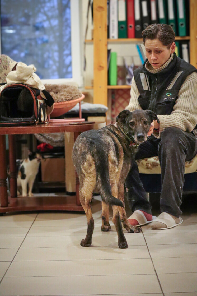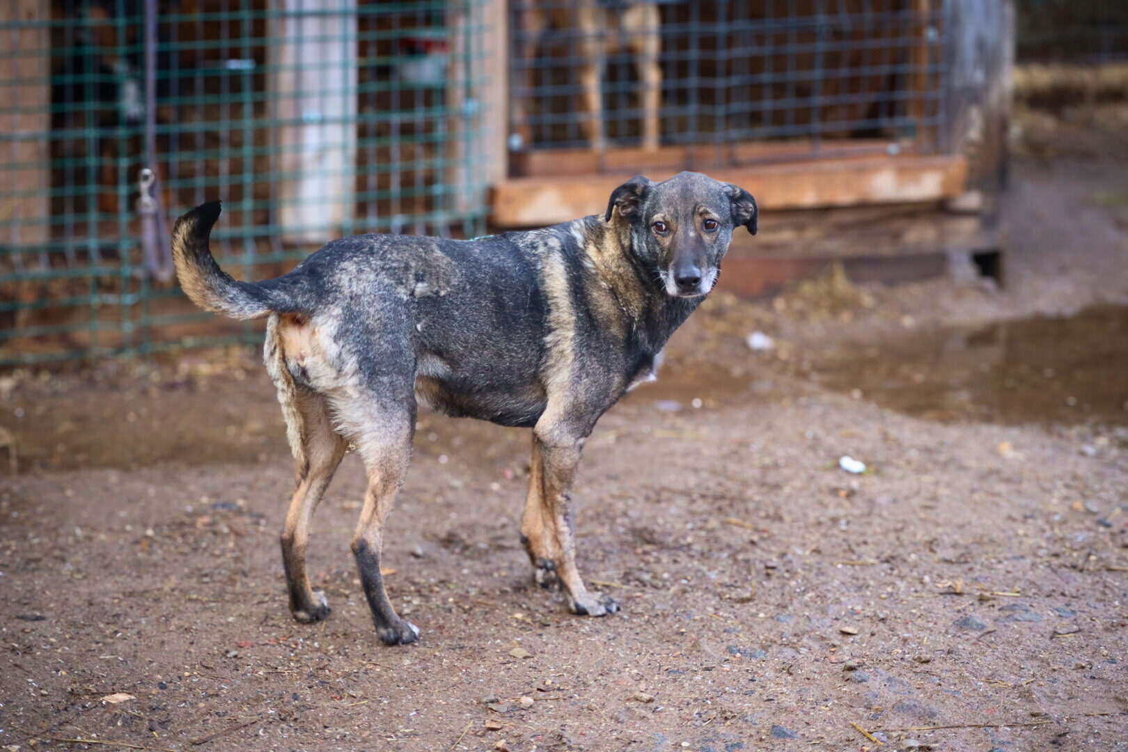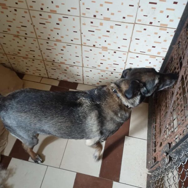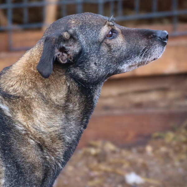 Patekimo į prieglaudą istorija neeilinė. 2024 m. spalį gavome pagalbos prašymą – moteris partrenkė šunį. Atvykus radome Pilkę griovyje. Jai lūžo dešinė priekinė ir galinė kojytės. Rentgeno tyrimas atskleidė dar vieną detalę – viena iš kojų buvo lūžusi ir anksčiau, joje jau buvo įdėta plokštelė. Šeimininkai taip ir neatsirado.