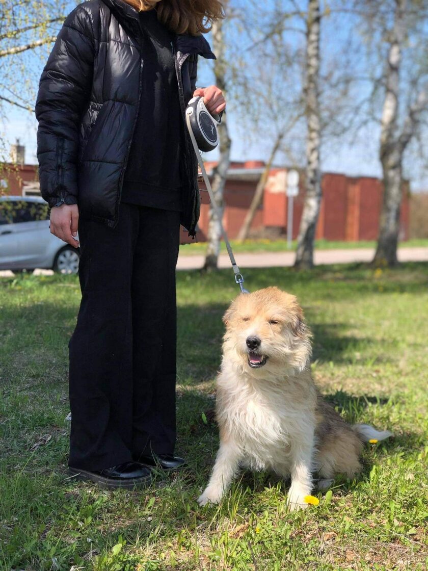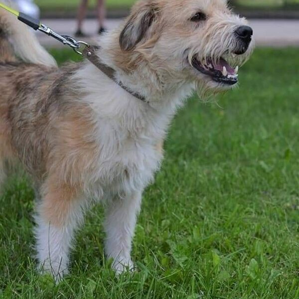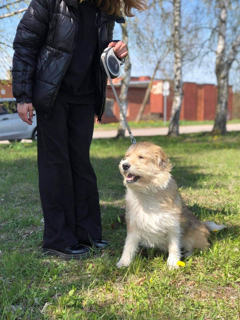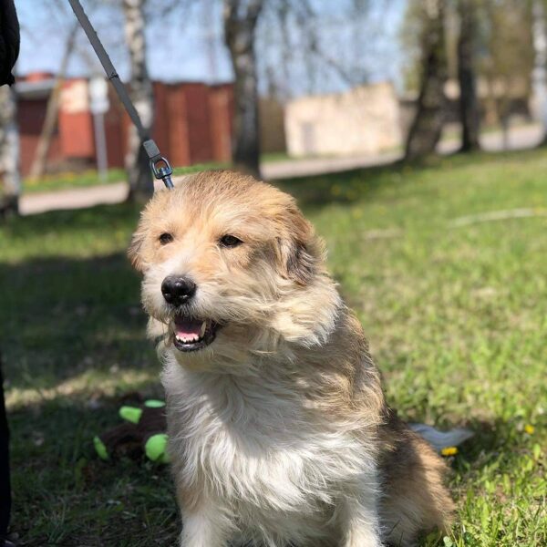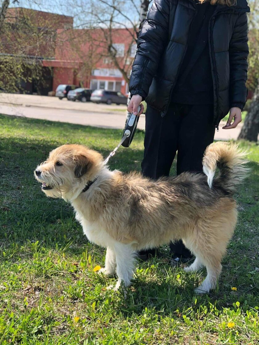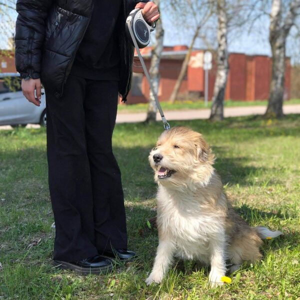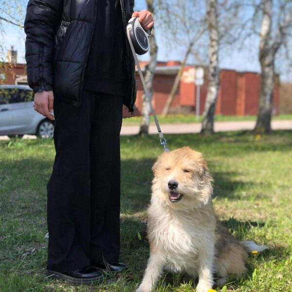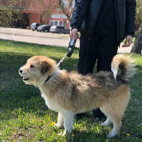 Puikiai ir džiaugsmingai vaikšto su pavadžiu bei sutaria su kai kuriais gyvūnais.