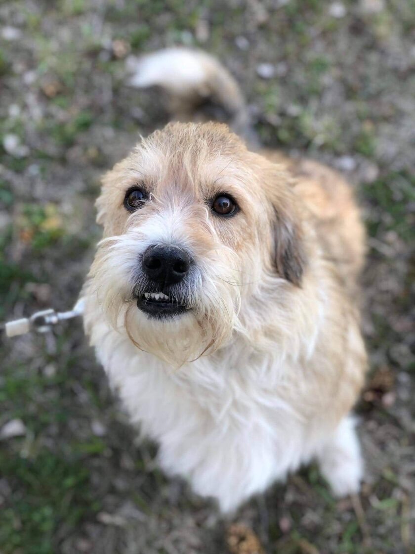 O juk jis šviesaus, garbanoto kailio, vidutinio dydžio, dailus Šuo